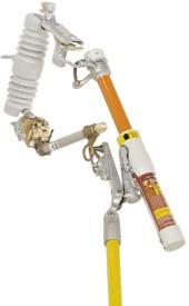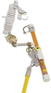 伸至熔断器的前,将Loadbuster便携式负荷开断工具的锚钩与熔断器远端的接环搭接,然后将熔断器的拉环与Loadbuster的拉环连结。Loadbuster便携式负荷开断工具的拉环闩能防止熔断器拉环与Loadbuster拉环钩意外脱离。